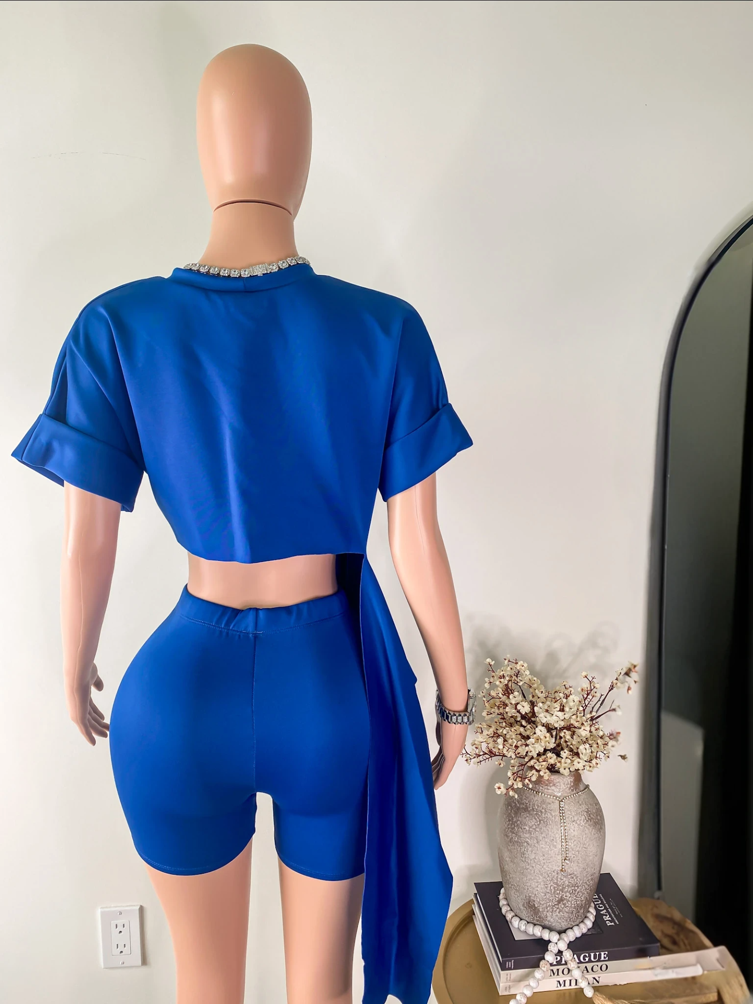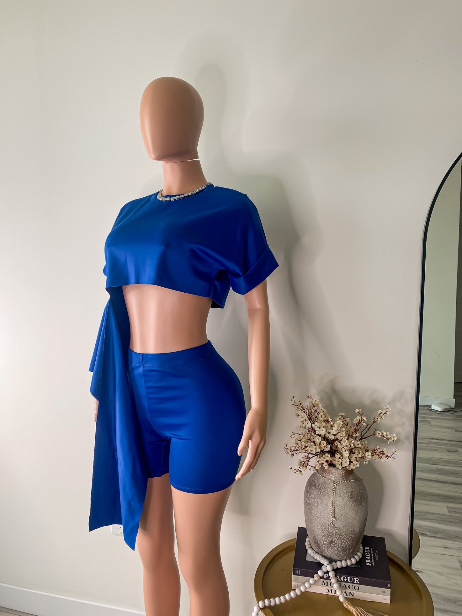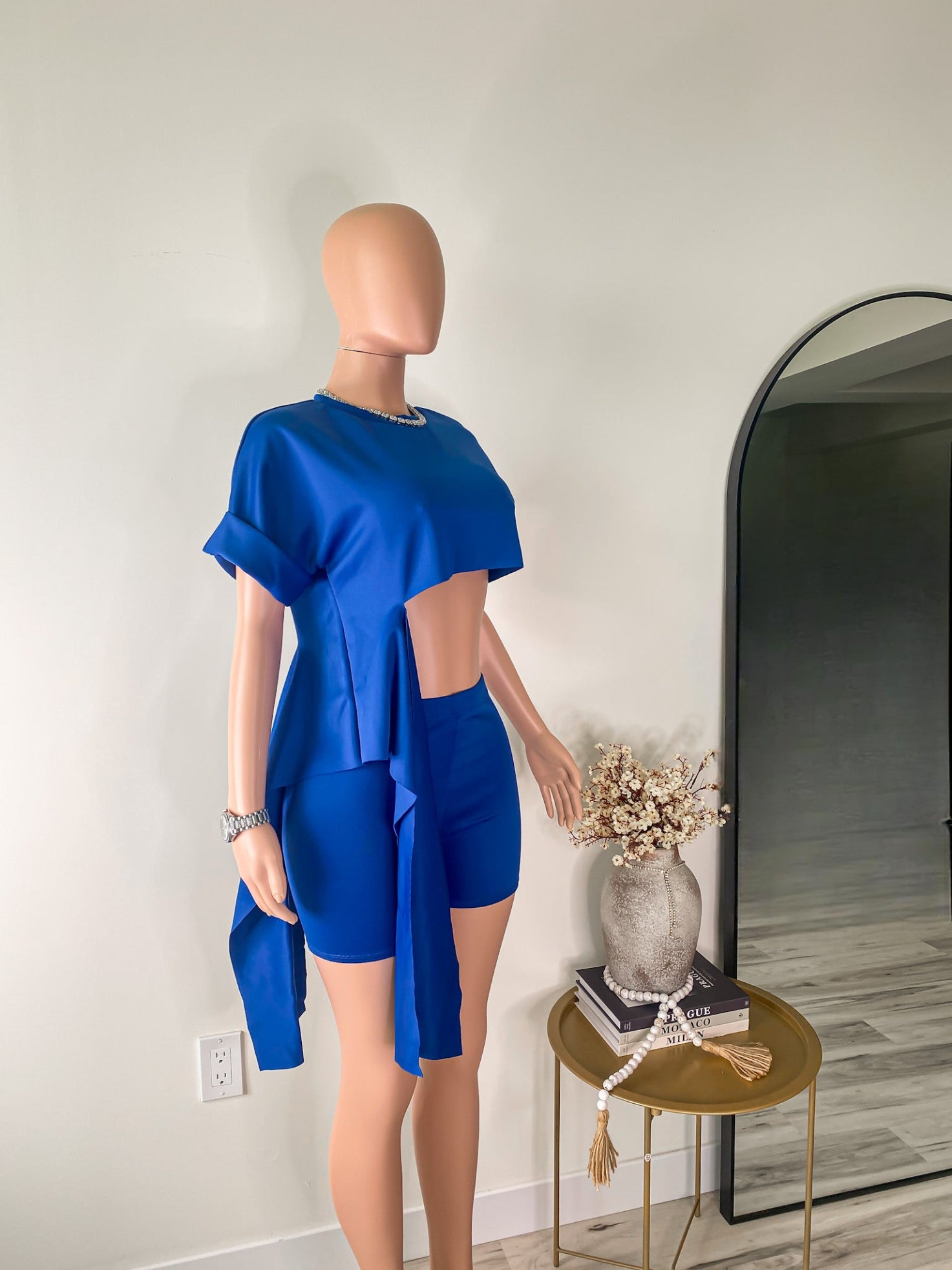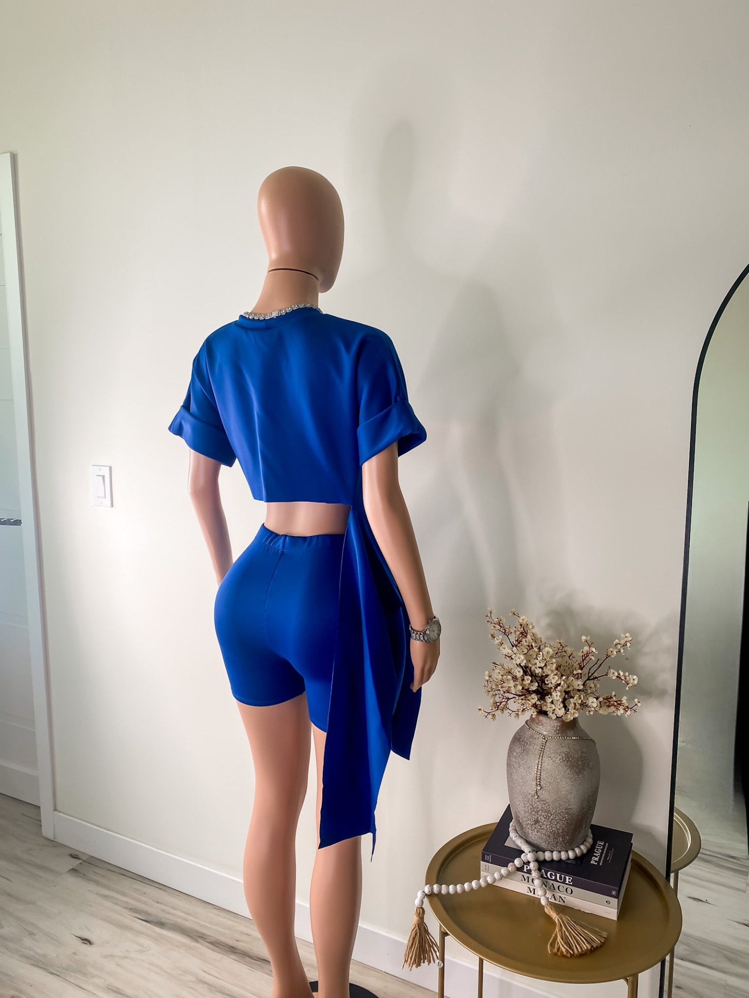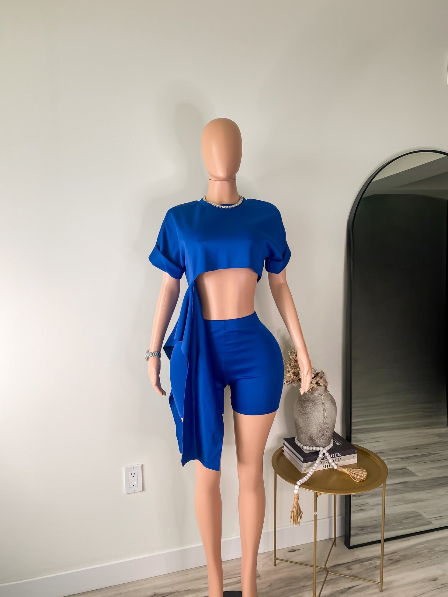 Step into your soft power in Flow State — a two-piece set that blends laid-back comfort with high-impact edge. The cropped tee features cuffed sleeves, an asymmetrical draped panel, and a built-in tie strap that lets you switch the vibe: cinch it tight, tie it low, or let it hang loose. Paired with sculpting biker shorts in a bold royal blue hue, this set brings movement, mood, and main character energy.
