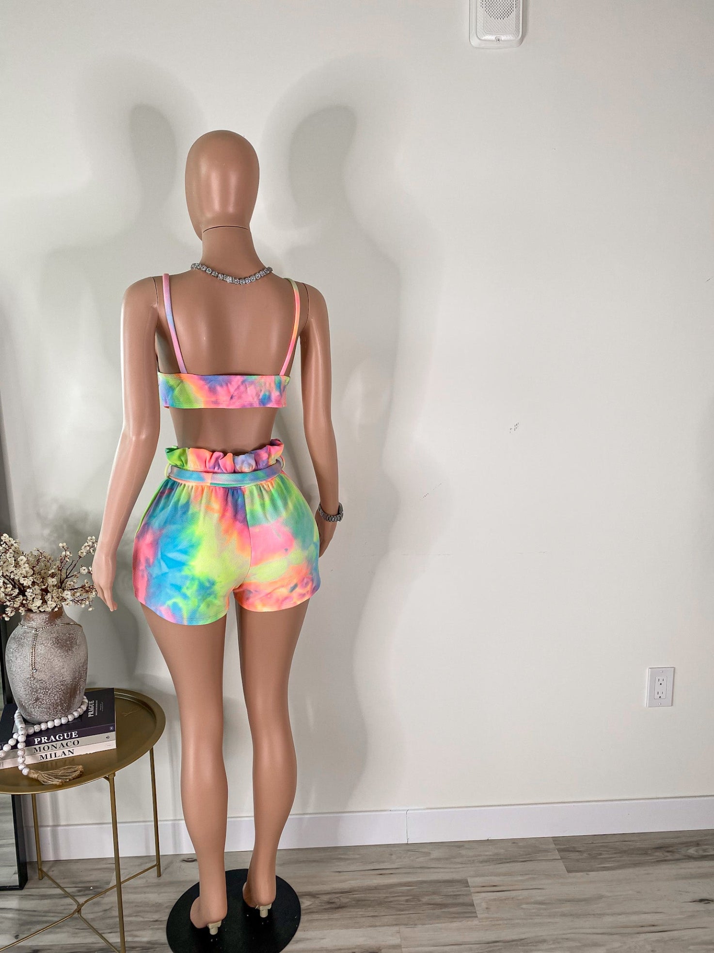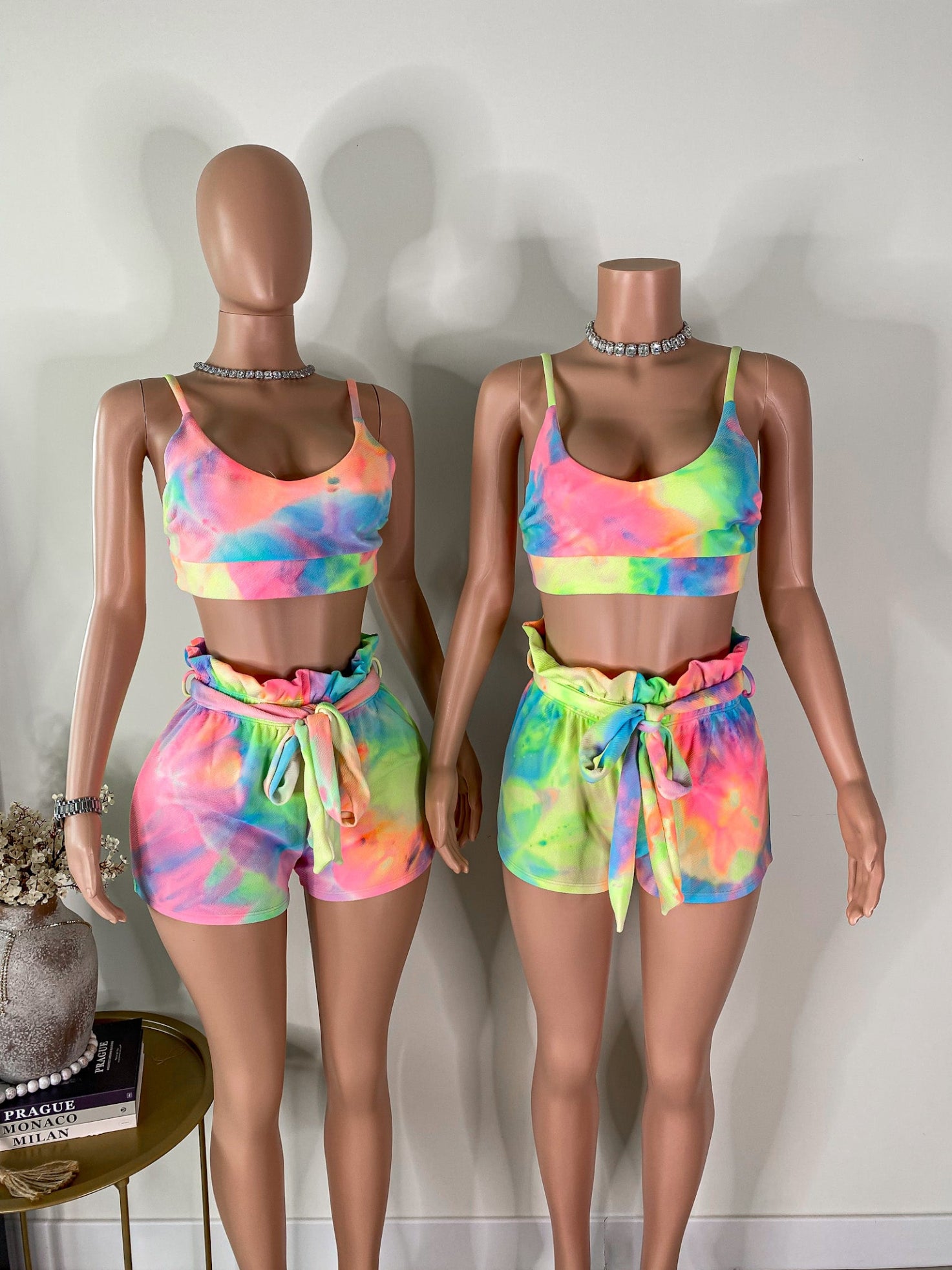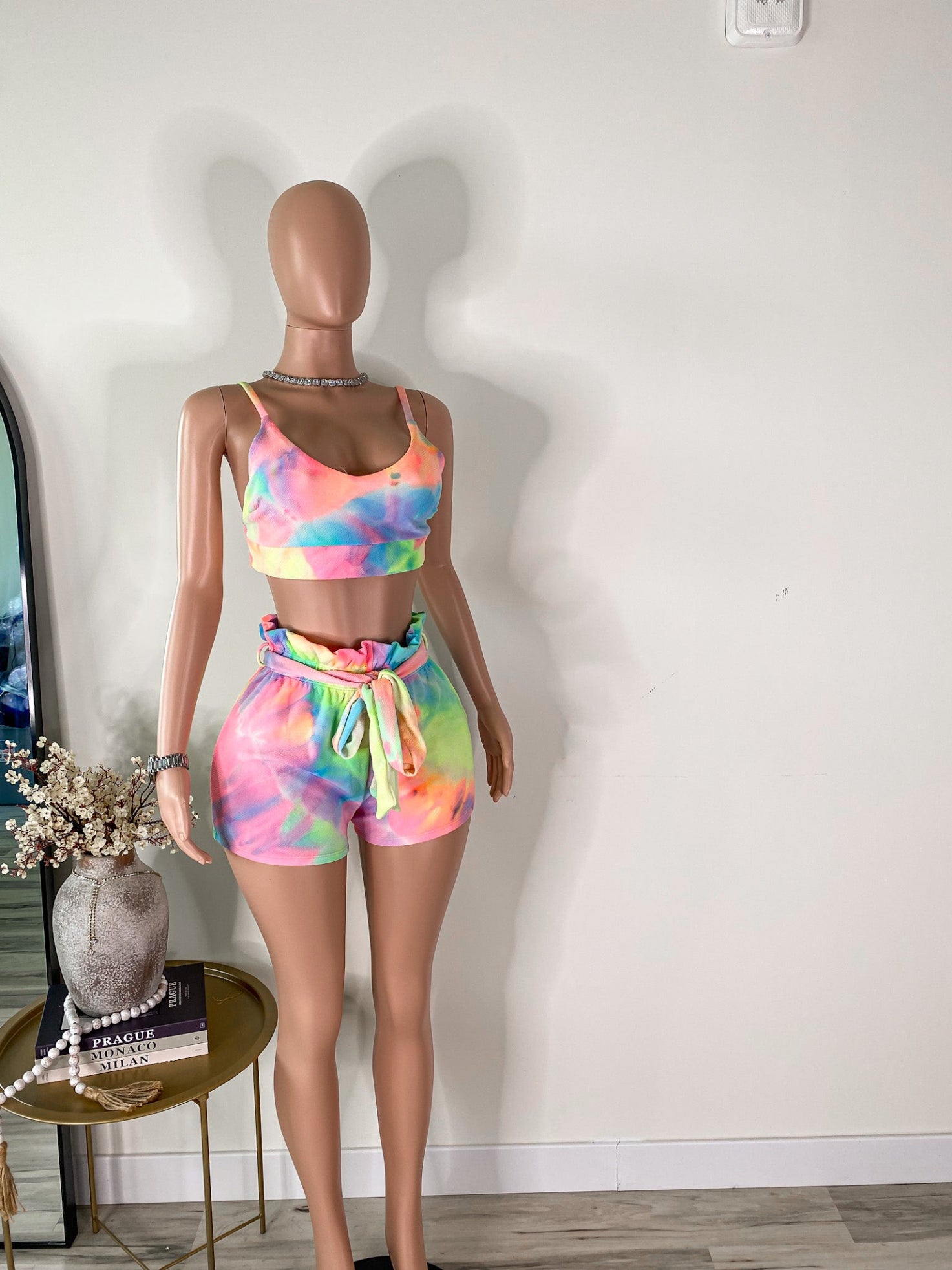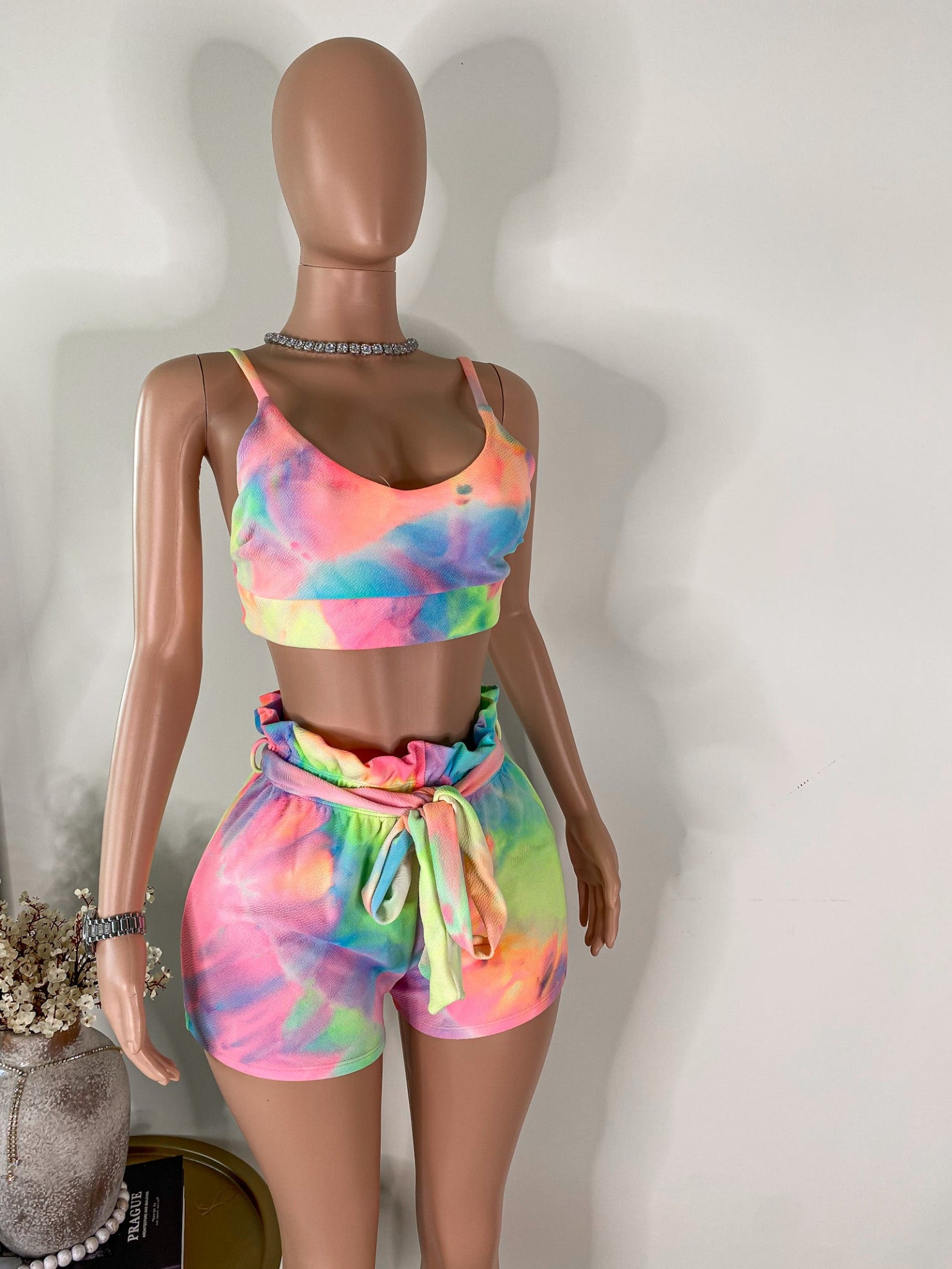 This vibrant duo features a scoop-neck crop top with fixed straps and a flattering, body-hugging fit, paired with high-waisted ruffle shorts complete with an elastic waistband and removable self-tie belt. The multicolor neon tie-dye print gives off playful, laid-back energy — perfect for catching sun or catching stares.