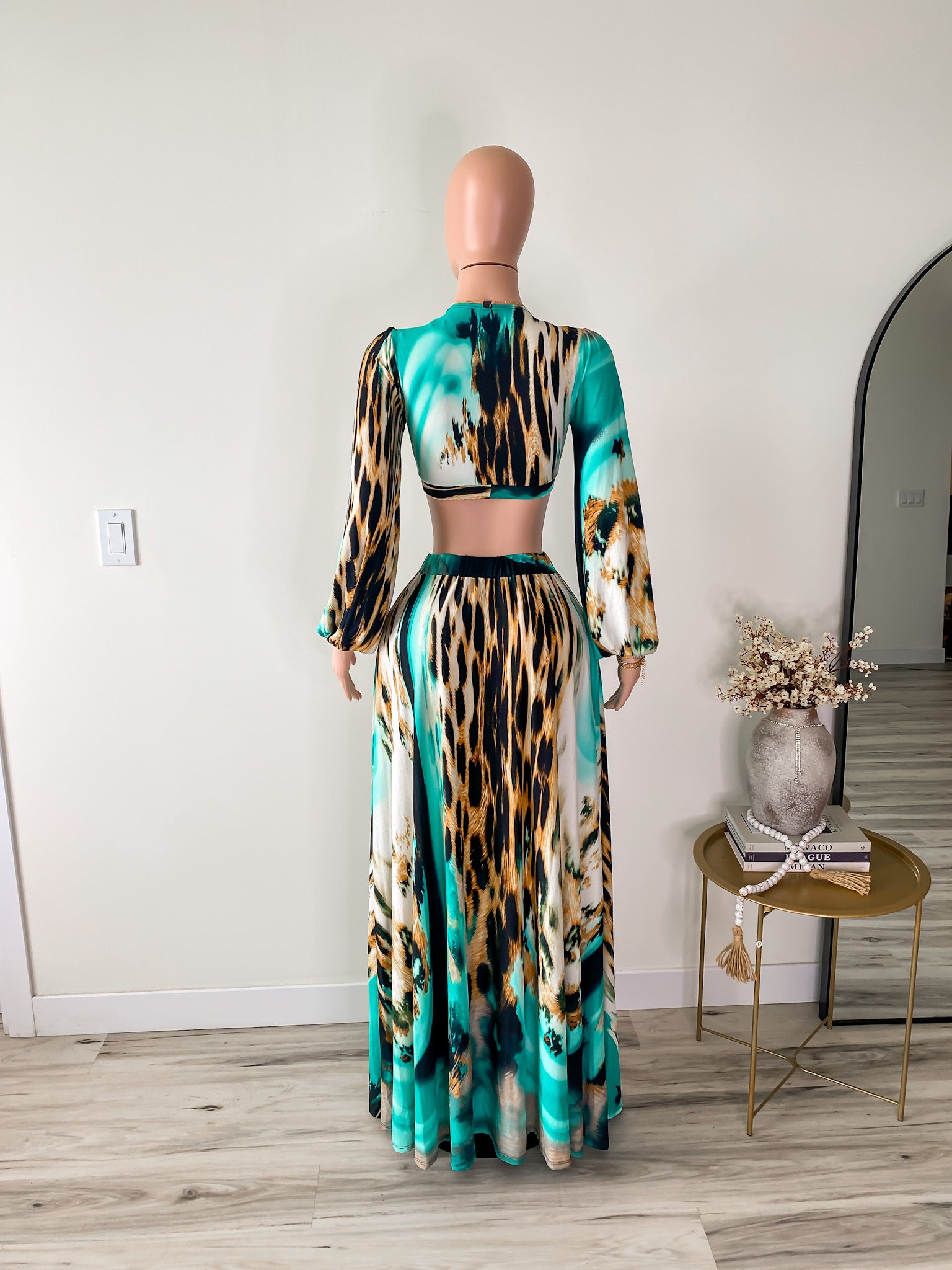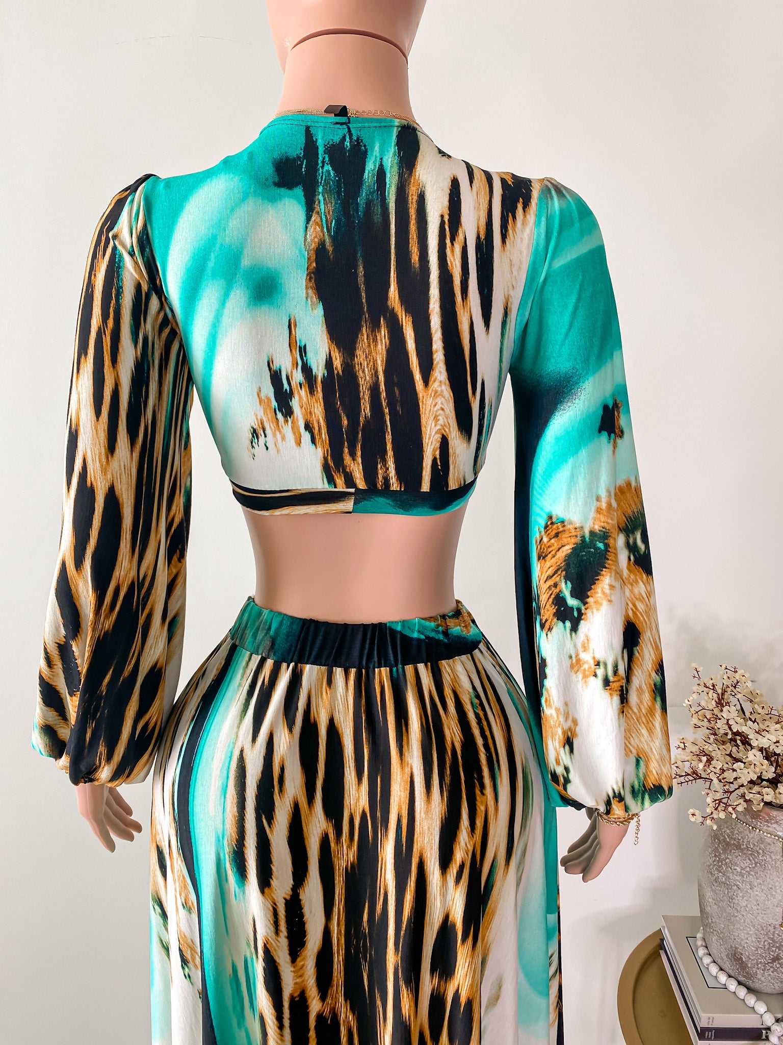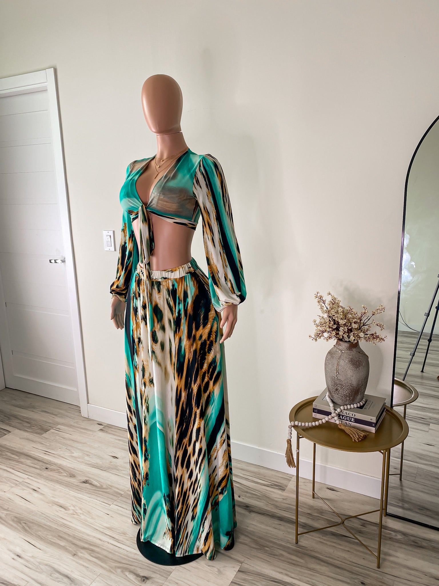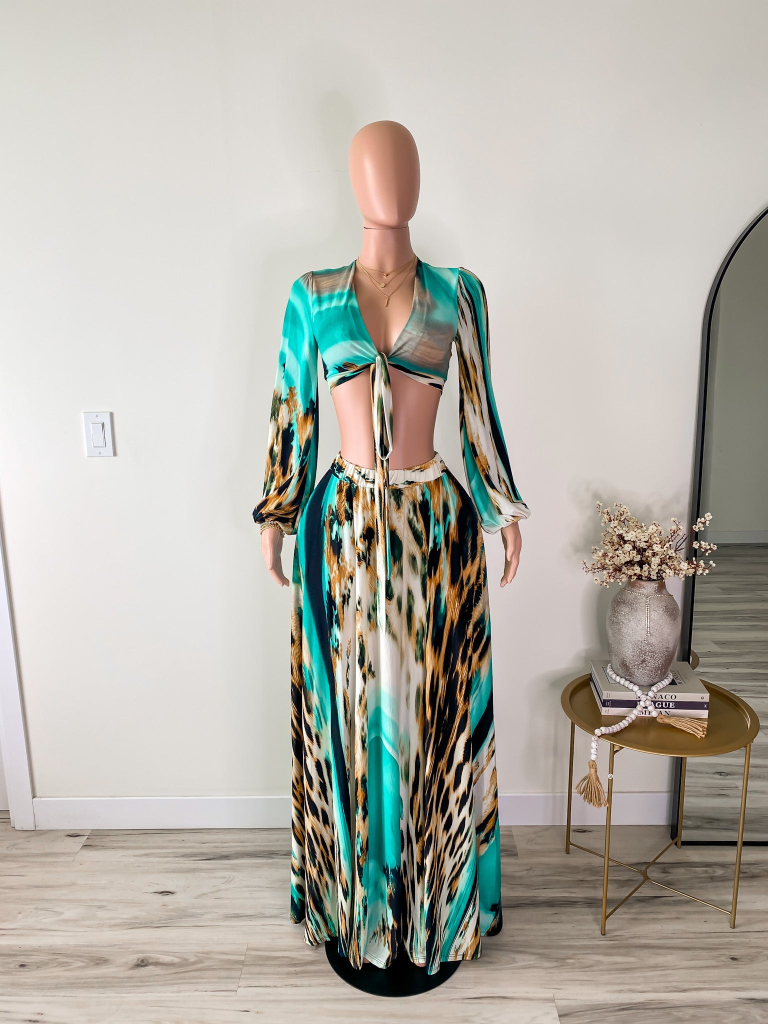 Unleash your inner wild with Savage Siren—a statement-making two-piece set that demands attention from every angle. It features a sultry tie-front crop top with long sleeves and a matching floor-grazing maxi skirt that moves like a dream. The teal-meets-leopard print fusion is giving exotic luxe—bold, untamed, and made to be seen.