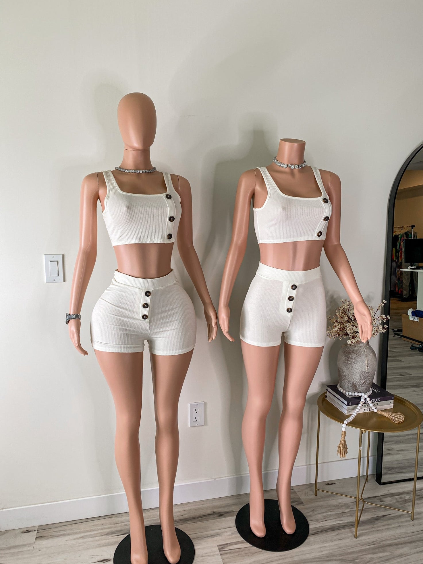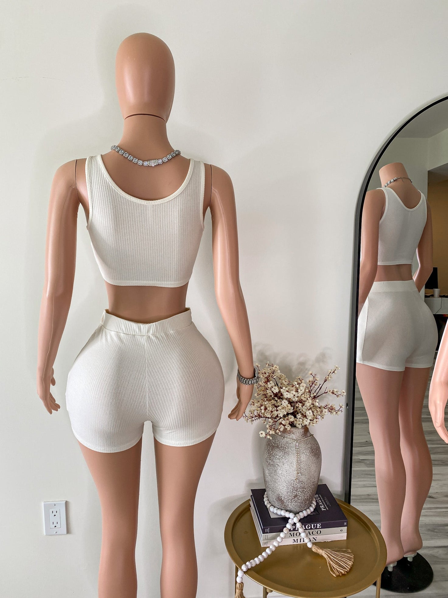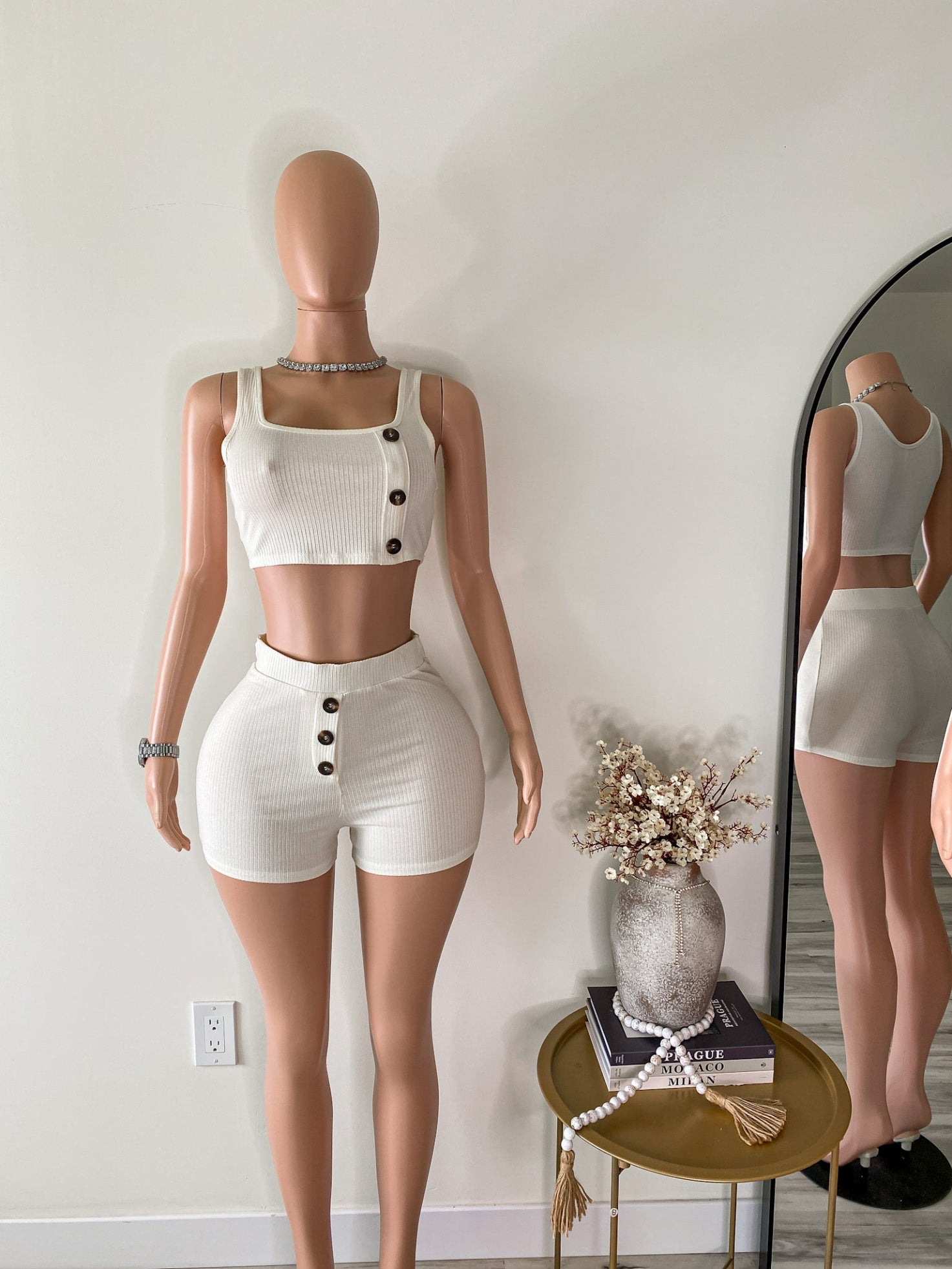 Minimal Intent – Ribbed Button Detail Lounge White Crop Top & High Waist Shorts Set