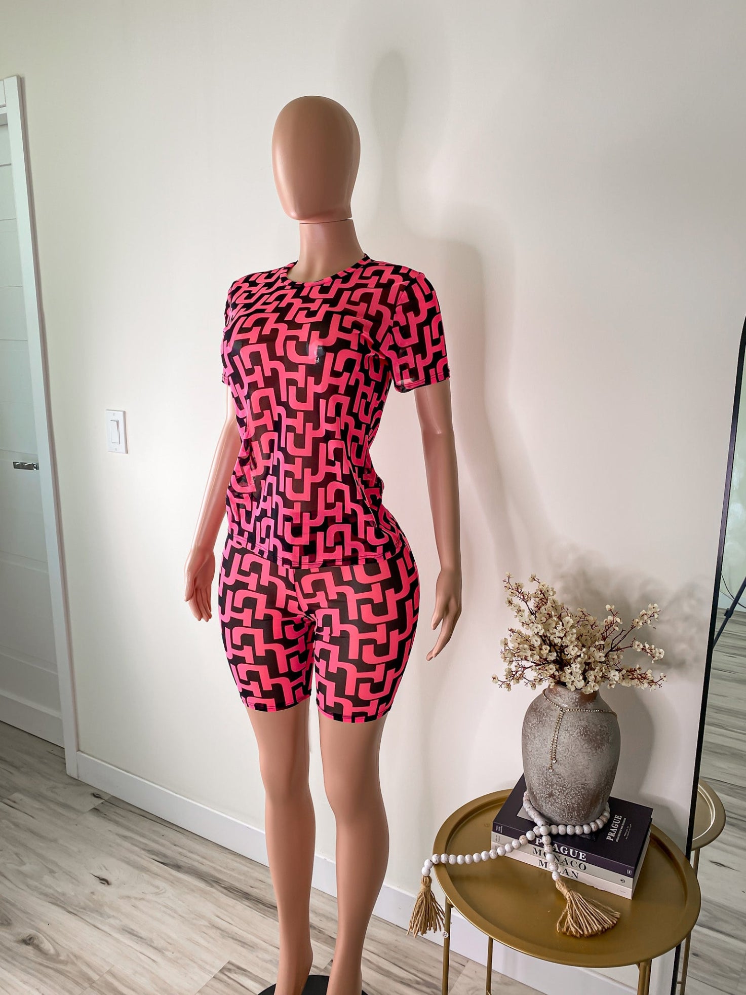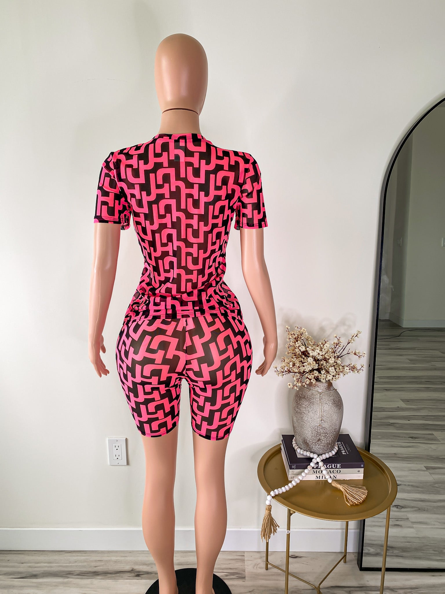 Step into the spotlight with Pattern Play — a bold, sheer two-piece set designed for the girl who doesn’t follow trends… she prints them. Featuring a fitted mesh tee and matching biker shorts in a striking retro-inspired geometric design, this look gives energy, movement, and pure bad girl confidence.